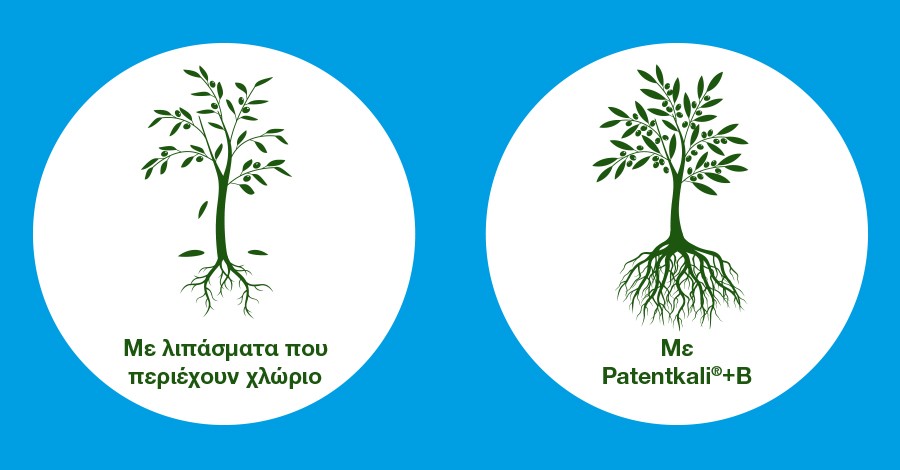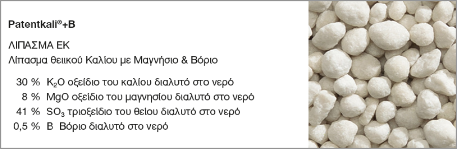 Το Patentkali+B είναι το νέο προϊόν που έχει σχεδιαστεί ώστε να δώσει περισσότερα πλεονεκτήματα στον Έλληνα ελαιοπαραγωγό. Το Patentkali+B του δίνει την δυνατότητα να εφαρμόσει το γνωστό προϊόν Patentkali μαζί με το Βόριο, την κατάλληλη εποχή με μια εφαρμογή. Είναι η επιλογή για τον καλύτερο εφοδιασμό των ελαιοδένδρων σε Κάλιο , Μαγνήσιο, Θείο & Βόριο. Μπορεί να χρησιμοποιηθεί και σε άλλες καλλιέργειες που είναι απαιτητικές σε βόριο όπως (δένδρα, αμπέλι, πατάτα κ.α.)