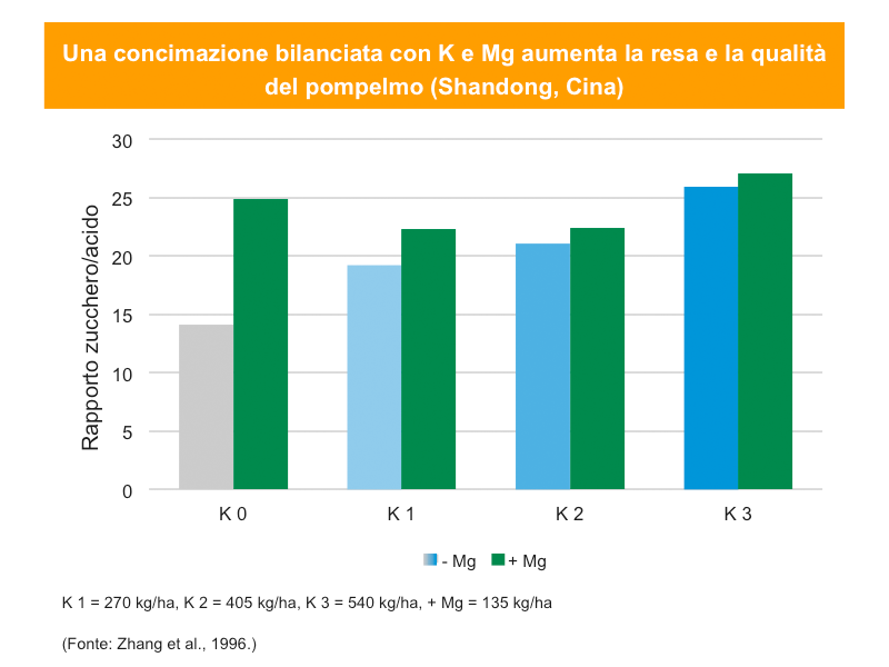 - Un’adeguata nutrizione potassica porta all’aumento del numero e della pezzatura dei frutti, migliora gli aspetti qualitativi quali acidità del succo e tenore di vitamina C.