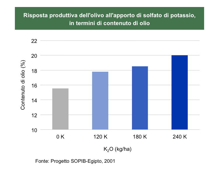 In considerazione della sensibilità al cloro dell’olivo e dell'effetto positivo dello zolfo su produttività e qualità dell'olio, si raccomanda una concimazione potassica e magnesiaca in forma solfatica. Le dosi riportate qui di seguito sono relative ad un oliveto in piena produzione.
