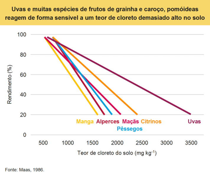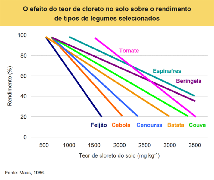 O efeito de grandes concentrações de cloreto na solução do solo sobre o rendimento de diversas culturas pode ser consultado na representação que se segue. Quanto mais inclinado é o retrocesso no rendimento à medida que vai aumentando o teor de cloreto no solo, quanto mais sensivelmente a cultura reage ao cloreto e quanto melhor é o efeito de fertilizantes quase isentos de cloreto, como, por exemplo KALISOP® e Patentkali®.
