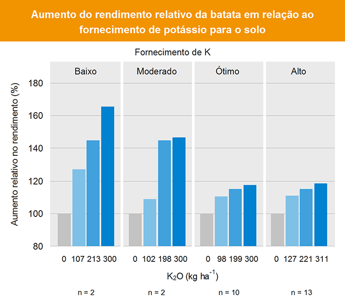 Potássio tem um efeito significativo no rendimento e na qualidade, já que a absorção pelas plantas é muito elevada quando comparada com outros nutrientes. Na verdade, uma cultura de batata absorve aprox. 60kg de K2O por cada 10t de tubérculos.